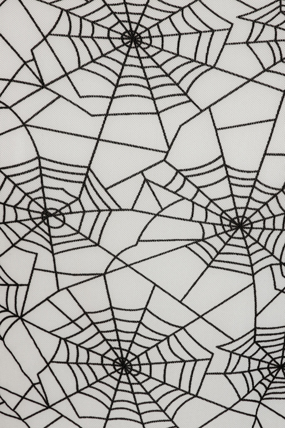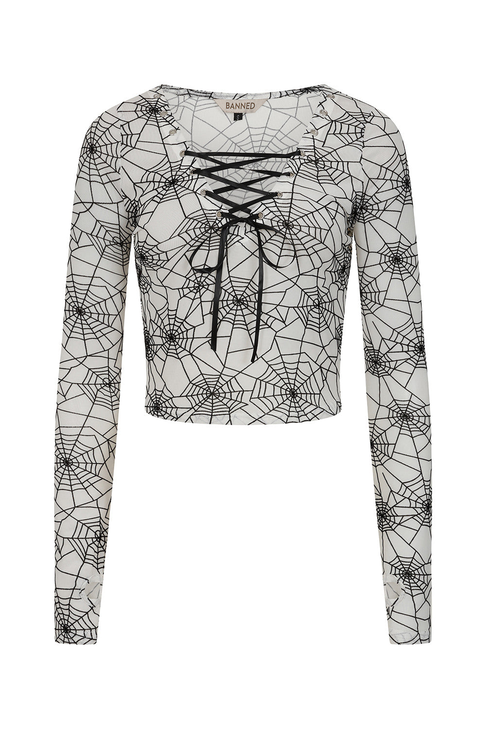 This Banned mesh top is an edgy piece with a mesh base fabric adorned with a black flocking spider web pattern, adding texture and a dramatic effect. The long sleeves include thumb holes, giving it a trendy, functional design element while keeping the sleeves securely in place. The lace-up detail at the neckline is accentuated with black laces threaded through silver eyelets, enhancing its modern and bold aesthetic. With its cropped cut and fitted silhouette, this top makes a statement perfect for Halloween-inspired outfits or alternative fashion styling.